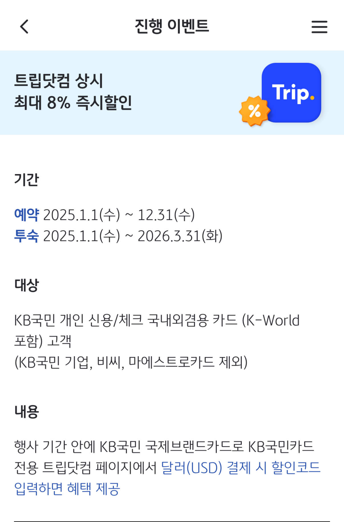 저는 국민카드를 이용했는데, KB PAY 앱에서 '트립닷컴'을 검색한 후 해당 링크를 통해 접속하면 프로모션 코드 적용이 가능했습니다.