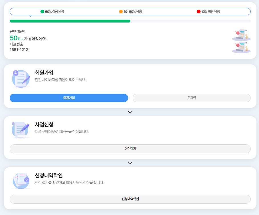 홈페이지에서는 현재 잔여예산 또한 확인할 수 있으며 회원가입부터 진행할 수 있게 순서가 나와 있습니다.